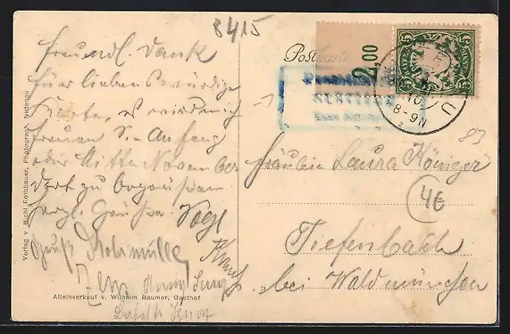 Personenbezogene Daten auf der Rückseite der Karte wurden durch blauen Textmarker unkenntlich gemacht. Die blauen Stellen sind auf die Vorderseite durchgeweicht und wirken sich negativ auf das Postkartenfoto aus