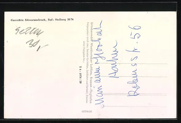 Personenbezogene Daten auf der Rückseite der Karte wurden durch blauen Textmarker unkenntlich gemacht. Die blauen Stellen sind auf die Vorderseite durchgeweicht und wirken sich negativ auf das Postkartenfoto aus