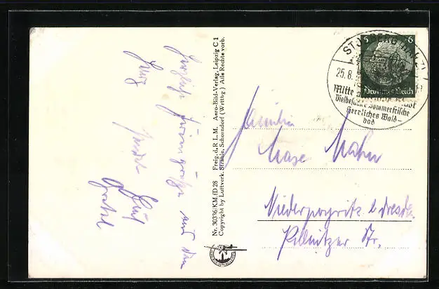 Personenbezogene Daten auf der Rückseite der Karte wurden durch blauen Textmarker unkenntlich gemacht. Die blauen Stellen sind auf die Vorderseite durchgeweicht und wirken sich negativ auf das Postkartenfoto aus