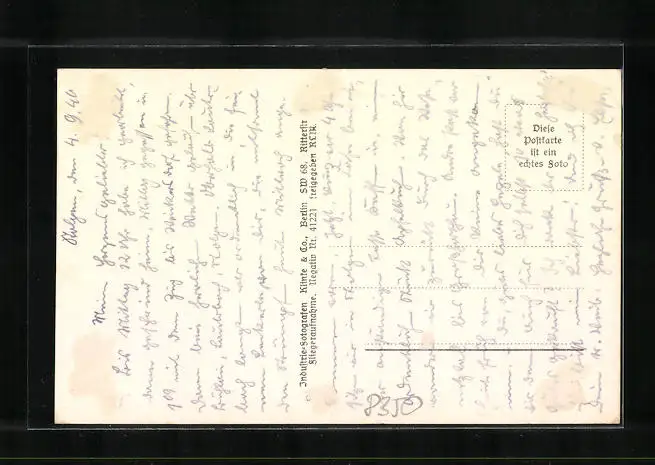 Personenbezogene Daten auf der Rückseite der Karte wurden durch blauen Textmarker unkenntlich gemacht. Die blauen Stellen sind auf die Vorderseite durchgeweicht und wirken sich negativ auf das Postkartenfoto aus
