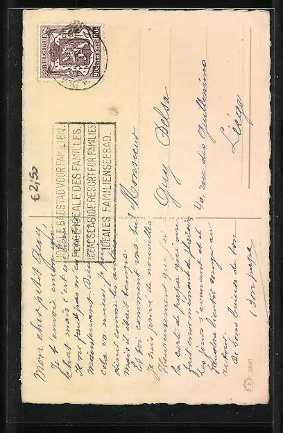 Personenbezogene Daten auf der Rückseite der Karte wurden durch blauen Textmarker unkenntlich gemacht. Die blauen Stellen sind auf die Vorderseite durchgeweicht und wirken sich negativ auf das Postkartenfoto aus