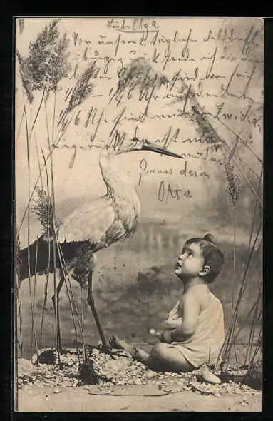 AK Storch neben einem Baby