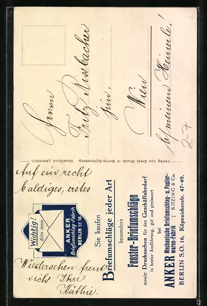Personenbezogene Daten auf der Rückseite der Karte wurden durch blauen Textmarker unkenntlich gemacht. Die blauen Stellen sind auf die Vorderseite durchgeweicht und wirken sich negativ auf das Postkartenfoto aus