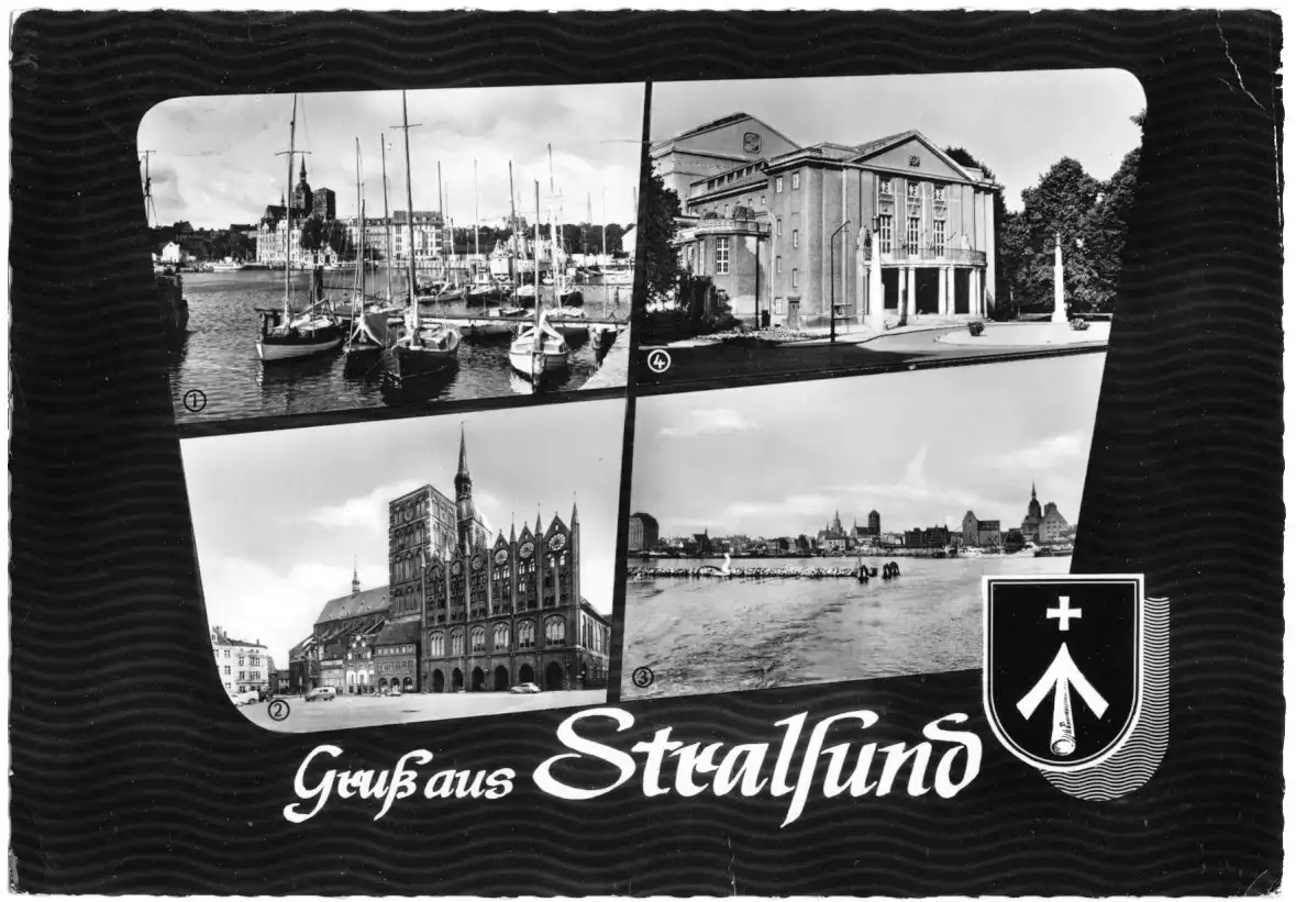 Ansichtskarte Stralsund vier Abb., - Hafen, Theater, Rathaus am Alten Markt, Blick zum Hafen, gestaltet Erhaltung I-II postalisch gelaufen, gestempelt: 18.8.63 Druckvermerk: 1963 Herstellungsland: DDR Verlag: Heldge-Verlag KG, Köthen Anhalt