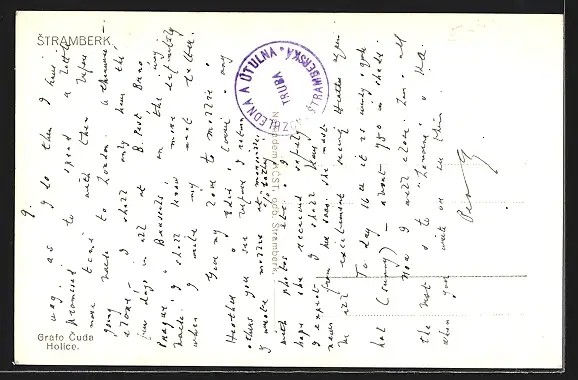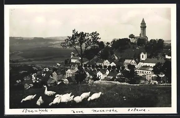 AK Stramberk, Ortsansicht mit Enten auf einer Wiese