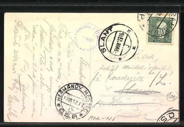 Personenbezogene Daten auf der Rückseite der Karte wurden durch blauen Textmarker unkenntlich gemacht. Die blauen Stellen sind auf die Vorderseite durchgeweicht und wirken sich negativ auf das Postkartenfoto aus