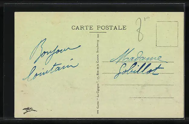 Personenbezogene Daten auf der Rückseite der Karte wurden durch blauen Textmarker unkenntlich gemacht. Die blauen Stellen sind auf die Vorderseite durchgeweicht und wirken sich negativ auf das Postkartenfoto aus