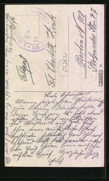 Personenbezogene Daten auf der Rückseite der Karte wurden durch blauen Textmarker unkenntlich gemacht. Die blauen Stellen sind auf die Vorderseite durchgeweicht und wirken sich negativ auf das Postkartenfoto aus