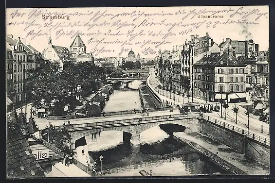 AK Strassburg, Jilpanorama und Brücke mit Strassenbahn