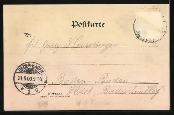 alte Ansichtskarte, gelaufen 1900, Briefmarke entfernt, rückseitig Oberflächenschaden, guter Zustand