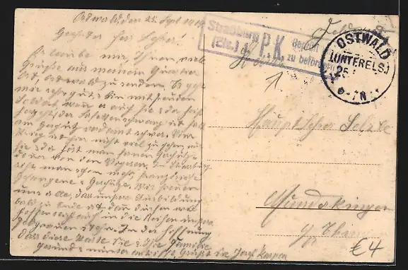 Personenbezogene Daten auf der Rückseite der Karte wurden durch blauen Textmarker unkenntlich gemacht. Die blauen Stellen sind auf die Vorderseite durchgeweicht und wirken sich negativ auf das Postkartenfoto aus