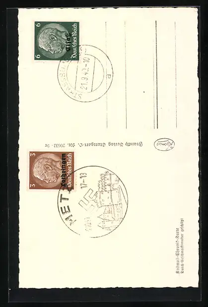 Personenbezogene Daten auf der Rückseite der Karte wurden durch blauen Textmarker unkenntlich gemacht. Die blauen Stellen sind auf die Vorderseite durchgeweicht und wirken sich negativ auf das Postkartenfoto aus