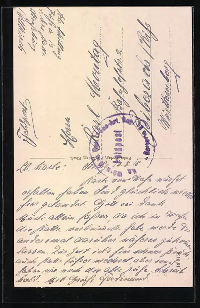 Personenbezogene Daten auf der Rückseite der Karte wurden durch blauen Textmarker unkenntlich gemacht. Die blauen Stellen sind auf die Vorderseite durchgeweicht und wirken sich negativ auf das Postkartenfoto aus