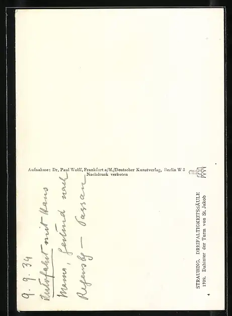 Personenbezogene Daten auf der Rückseite der Karte wurden durch blauen Textmarker unkenntlich gemacht. Die blauen Stellen sind auf die Vorderseite durchgeweicht und wirken sich negativ auf das Postkartenfoto aus