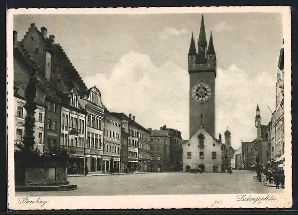 AK Straubing, Ludwigsplatz mit Geschäften und Denkmal