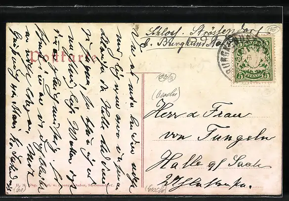Personenbezogene Daten auf der Rückseite der Karte wurden durch blauen Textmarker unkenntlich gemacht. Die blauen Stellen sind auf die Vorderseite durchgeweicht und wirken sich negativ auf das Postkartenfoto aus