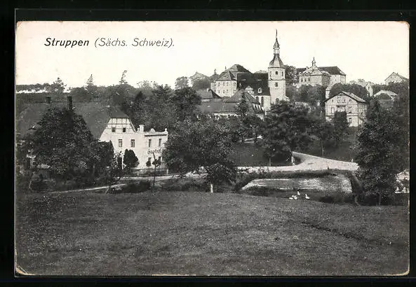 AK Struppen /Sächs. Schweiz, Uferpartie mit Gasthof