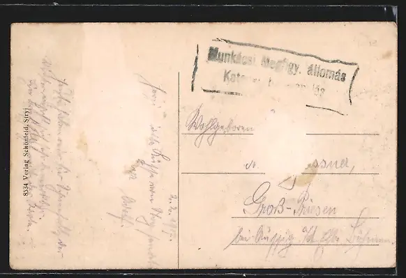 Personenbezogene Daten auf der Rückseite der Karte wurden durch blauen Textmarker unkenntlich gemacht. Die blauen Stellen sind auf die Vorderseite durchgeweicht und wirken sich negativ auf das Postkartenfoto aus