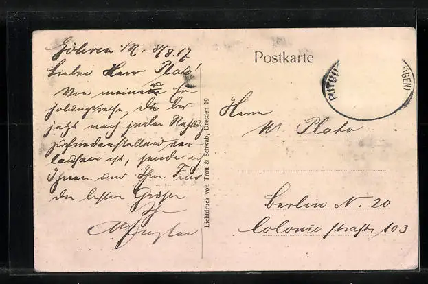 alte Ansichtskarte, gelaufen 1917, Briefmarke entfernt, Eckknick unten links, guter Zustand