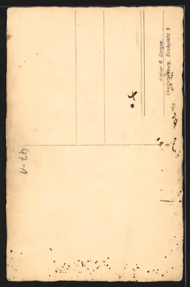 Personenbezogene Daten auf der Rückseite der Karte wurden durch blauen Textmarker unkenntlich gemacht. Die blauen Stellen sind auf die Vorderseite durchgeweicht und wirken sich negativ auf das Postkartenfoto aus