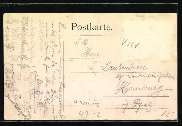 Personenbezogene Daten auf der Rückseite der Karte wurden durch blauen Textmarker unkenntlich gemacht. Die blauen Stellen sind auf die Vorderseite durchgeweicht und wirken sich negativ auf das Postkartenfoto aus