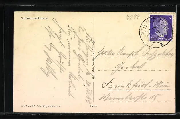Personenbezogene Daten auf der Rückseite der Karte wurden durch blauen Textmarker unkenntlich gemacht. Die blauen Stellen sind auf die Vorderseite durchgeweicht und wirken sich negativ auf das Postkartenfoto aus