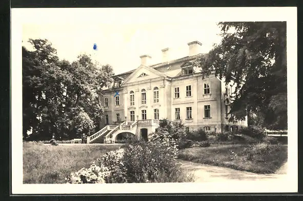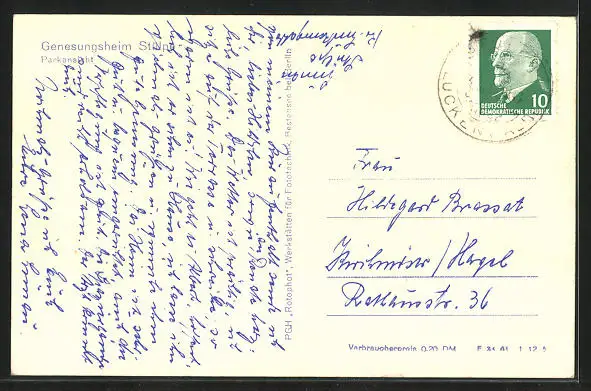 Personenbezogene Daten auf der Rückseite der Karte wurden durch blauen Textmarker unkenntlich gemacht. Die blauen Stellen sind auf die Vorderseite durchgeweicht und wirken sich negativ auf das Postkartenfoto aus
