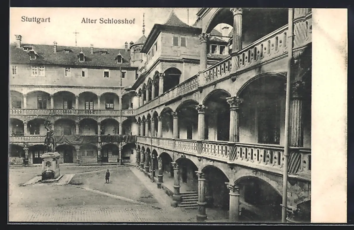 AK Stuttgart, Alter Schlosshof mit Denkmal