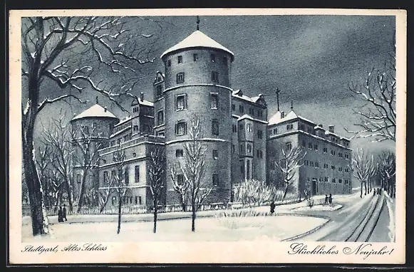 AK Stuttgart, Altes Schloss im Winter, Neujahrsgruss