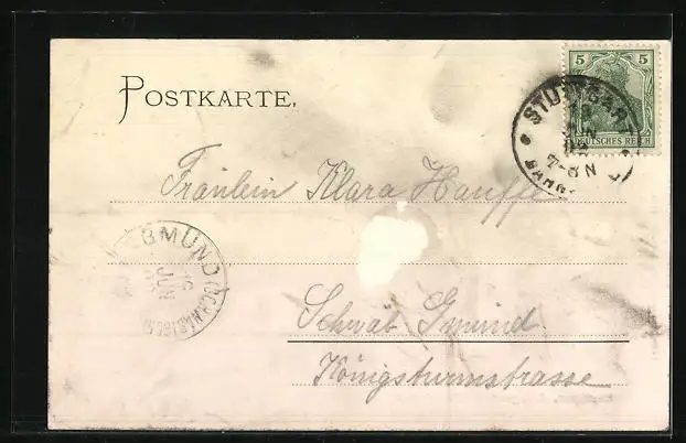 Personenbezogene Daten auf der Rückseite der Karte wurden durch blauen Textmarker unkenntlich gemacht. Die blauen Stellen sind auf die Vorderseite durchgeweicht und wirken sich negativ auf das Postkartenfoto aus