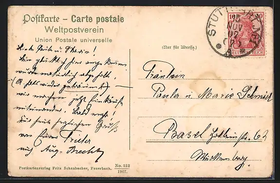 gelaufen 1907, Eckknicke li. und oben re., guter Zustand