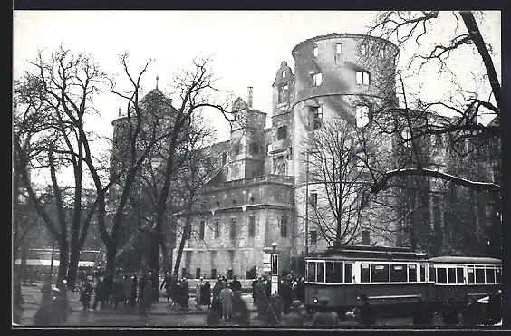 AK Stuttgart, Brand des alten Schlosses 1931 und Strassenbahn