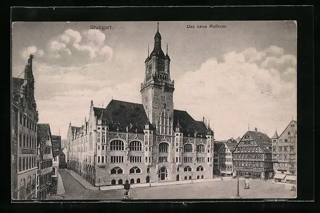 AK Stuttgart, Das neue Rathaus mit Litfasssäule