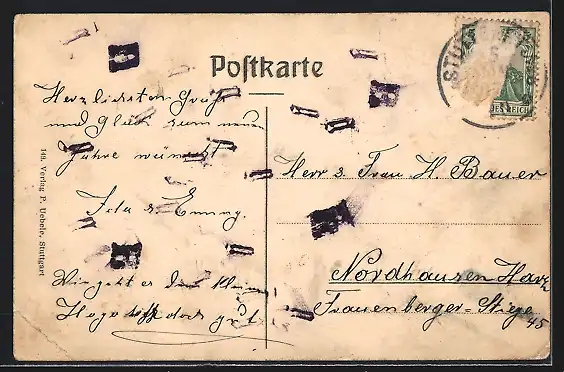 Personenbezogene Daten auf der Rückseite der Karte wurden durch blauen Textmarker unkenntlich gemacht. Die blauen Stellen sind auf die Vorderseite durchgeweicht und wirken sich negativ auf das Postkartenfoto aus