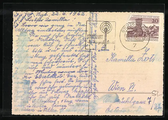 Personenbezogene Daten auf der Rückseite der Karte wurden durch blauen Textmarker unkenntlich gemacht. Die blauen Stellen sind auf die Vorderseite durchgeweicht und wirken sich negativ auf das Postkartenfoto aus