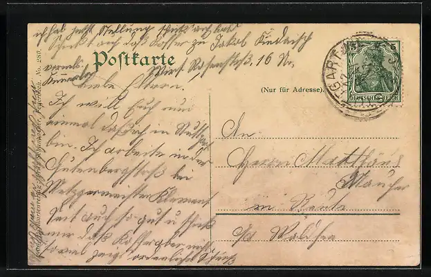 Personenbezogene Daten auf der Rückseite der Karte wurden durch blauen Textmarker unkenntlich gemacht. Die blauen Stellen sind auf die Vorderseite durchgeweicht und wirken sich negativ auf das Postkartenfoto aus