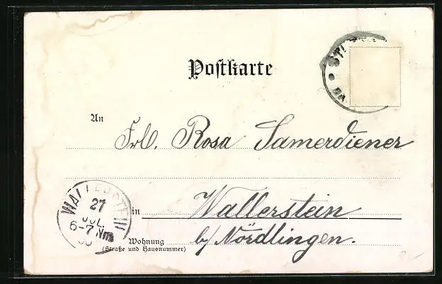 Personenbezogene Daten auf der Rückseite der Karte wurden durch blauen Textmarker unkenntlich gemacht. Die blauen Stellen sind auf die Vorderseite durchgeweicht und wirken sich negativ auf das Postkartenfoto aus