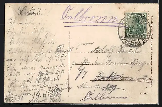 Personenbezogene Daten auf der Rückseite der Karte wurden durch blauen Textmarker unkenntlich gemacht. Die blauen Stellen sind auf die Vorderseite durchgeweicht und wirken sich negativ auf das Postkartenfoto aus