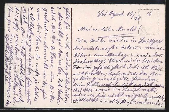 Personenbezogene Daten auf der Rückseite der Karte wurden durch blauen Textmarker unkenntlich gemacht. Die blauen Stellen sind auf die Vorderseite durchgeweicht und wirken sich negativ auf das Postkartenfoto aus