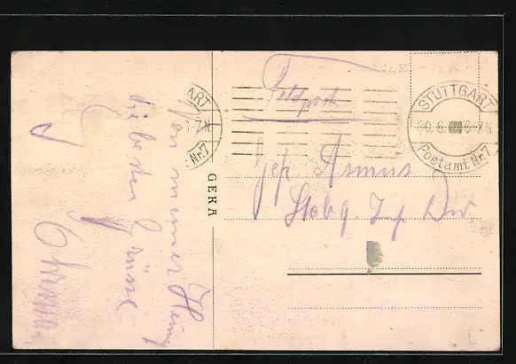 Personenbezogene Daten auf der Rückseite der Karte wurden durch blauen Textmarker unkenntlich gemacht. Die blauen Stellen sind auf die Vorderseite durchgeweicht und wirken sich negativ auf das Postkartenfoto aus