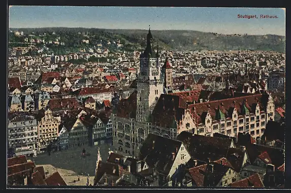 AK Stuttgart, Ortsansicht mit dem Rathaus aus der Vogelschau