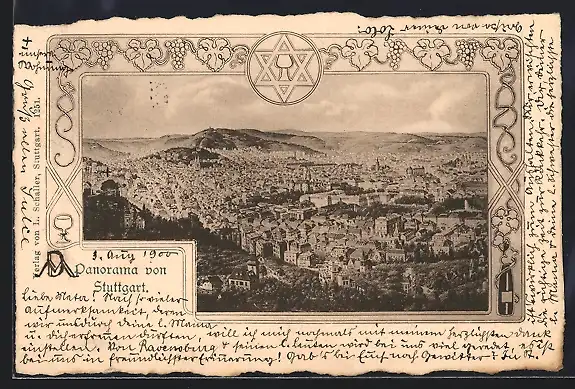 AK Stuttgart, Panoramablick über die Stadt, Wein-Passepartout