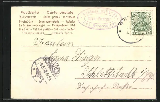Personenbezogene Daten auf der Rückseite der Karte wurden durch blauen Textmarker unkenntlich gemacht. Die blauen Stellen sind auf die Vorderseite durchgeweicht und wirken sich negativ auf das Postkartenfoto aus