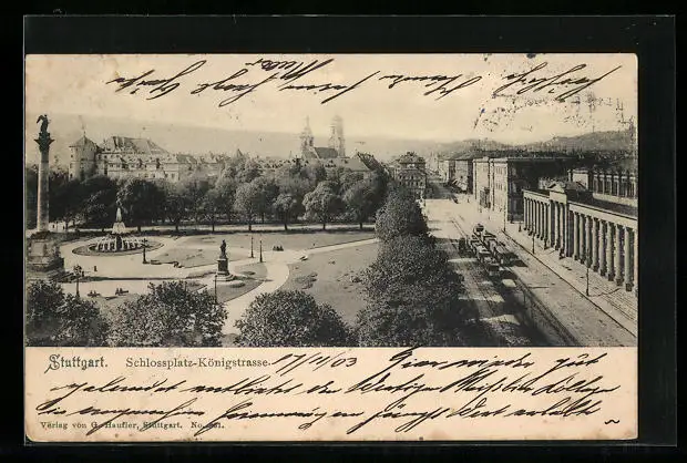 AK Stuttgart, Schlossplatz an der Königstrasse, Blick zur Strassenbahn