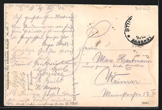 Personenbezogene Daten auf der Rückseite der Karte wurden durch blauen Textmarker unkenntlich gemacht. Die blauen Stellen sind auf die Vorderseite durchgeweicht und wirken sich negativ auf das Postkartenfoto aus