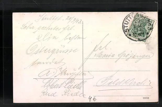 Personenbezogene Daten auf der Rückseite der Karte wurden durch blauen Textmarker unkenntlich gemacht. Die blauen Stellen sind auf die Vorderseite durchgeweicht und wirken sich negativ auf das Postkartenfoto aus