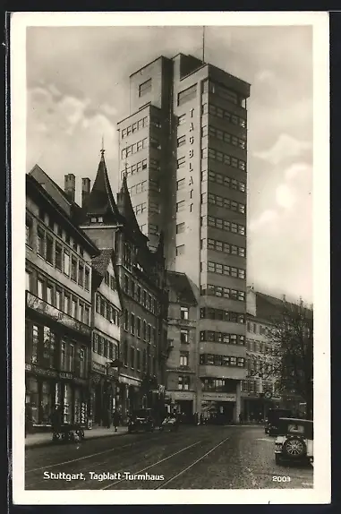 AK Stuttgart, Tagblatt-Turmhaus mit Strasse, Bauhaus