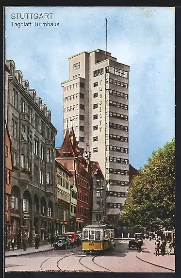 AK Stuttgart, Tagblatt-Turmhaus mit Strassenbahn