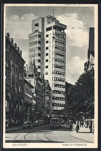 AK Stuttgart, Tagblatt-Turmhaus mit Strassenbahn