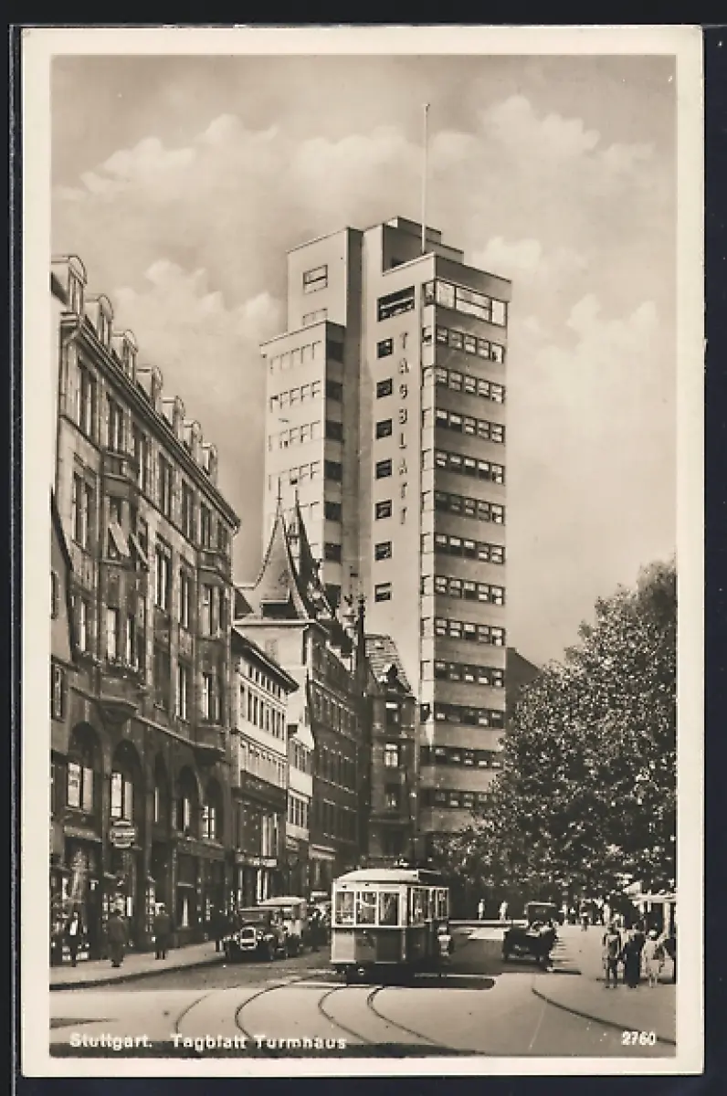AK Stuttgart, Tagblatt Turmhaus mit Strassenbahn